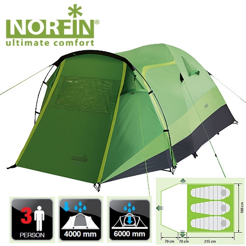 Палатка купольного типа для путешествий с большим багажом. -двухслойная палатка с тремя входами -увеличенный тамбур для комфортного размещения поклажи -вход в палатку продублирован антимоскитной сеткой -кармашки для мелочей -прозрачное окно в тамбуре -вентиляционные окна с ветровыми клапанами обеспечивают хорошую вентиляцию -крючок для подвески фонаря -все швы палатки герметизированы при помощи термоусадочной водонепроницаемой ленты -веревки оттяжек со светоотражающей нитью -специальный чехол-стяжка для фиксации каждой сложенной веревки-оттяжки -петли для фиксации скатанного входа -площадь крепления нижних оттяжек усилена дополнительной вставкой Тип палатки: треккинговая Количество мест: 3 Материал наружной палатки/влагостойкость: RipStop Polyester 210T 70D PU/4000mm Материал внутренней палатки: 190T Polyester дышащий Материал дна/ влагостойкость: Polyester 210D Oxford PU/6000mm Материал каркаса: FG Материал колышков: сталь Количество дуг/диаметр(мм): 3/8,5