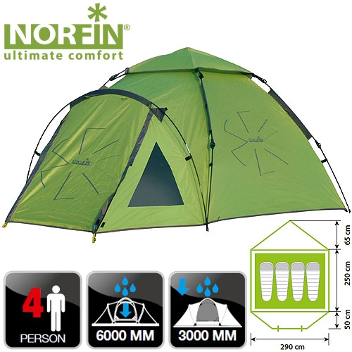 Двухслойная 4-х местная палатка с полуавтоматическим быстро сборным каркасом. Два компактных тамбурa на входах в палатку. Внутренняя палатка и тент устанавливаются одновременно. Установка палатки может быть совершена одним человеком за считанные секунды.