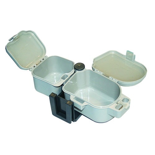 Коробочка для живой наживки с двумя отделениями и с легкосъемным креплением к ремню рыболова.