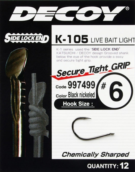 Крючки Decoy K-105 изготовлены из относительно тонкой проволоки с химической заточкой жала. Оснащены лопаткой с системой «Side Lock End», имеющей специальные насечки на цевье в том месте, где должен располагаться узел. Благодаря этому леска затягивается более плотно и без лишних изгибов, что предотвращает её соскальзывание и перетирание в месте крепления.