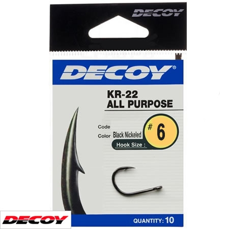 Крючок Decoy KR-22 изготовлен из довольно толстой проволоки, способной выдержать рывки крупной рыбы. Жало с химической заточкой подогнуто внутрь и способно с лёгкостью вонзаться в рыбьи губы, а бородка уже удерживает трофей до самого берега. Благодаря круглому изгибу данная серия крючков идеально подходит для ловли на растительные насадки. Мощности крючка будет достаточно для ловли рыбы в сложных условиях, когда нужно форсировать вываживание, а также возможно его применение в карповой ловле.