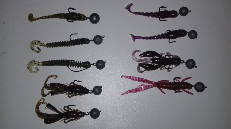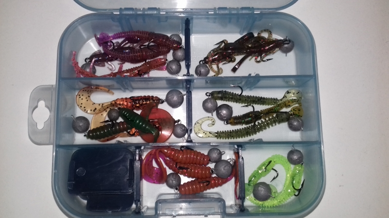 Набор состоит из 16 шарнирных монтажей на ушастиках весом от 3 до 8 г, которые изготовлены из твистеров Mans 2, и сьедобных приманок Lucky John (Tioga 2.4, Ballist 2.5, Rock Craw 2, Hogy Hog 1,6). Расцветки подобраны под самые разные условия и водоемы. Набор компактно укомплектован в коробку Aquatech