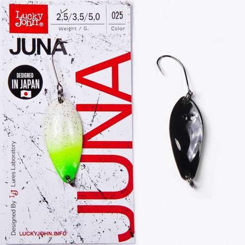 Lucky John JUNA — серия колеблющихся блесен для ультрала- и лайтовой спиннинговой ловли форели. Эти блесны соответствуют всем требованиям , предъявляемым к приманкам для ловли форели на платных, а так же для ловли рыбы в естественных водоемах и речках со средним течением и с небольшими глубинами.