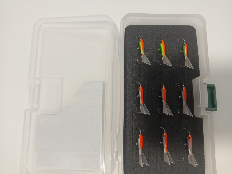 Набір складається з 9 мікробалансирів Мікроб вагою 2,4г довжина 18 мм та коробки Meiho Case M. Балансири підібрані самих робочих кольорів на окуня.